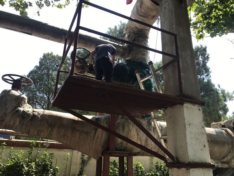 在鐵塔寺小區(qū)檢修現(xiàn)場,幾名檢修人員正頂著近36度的高溫對二次網(wǎng)管道的保溫進行修補、更換。雖然天氣悶熱,但為了保證冬季供暖效果、減少不必要的損耗、確保設(shè)備狀態(tài)良好,他們加班加點,趕著在天黑之前完成此項檢修工作。